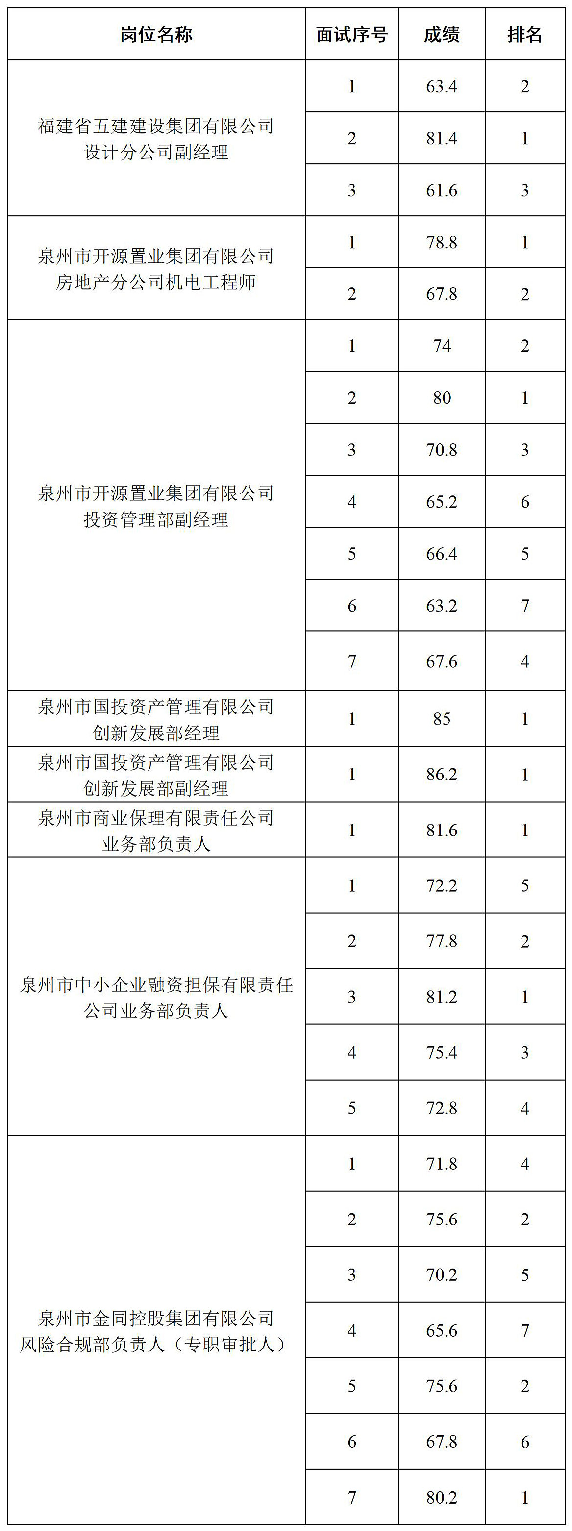 泉州发展集团人才引进招聘部分岗位面试成绩公示