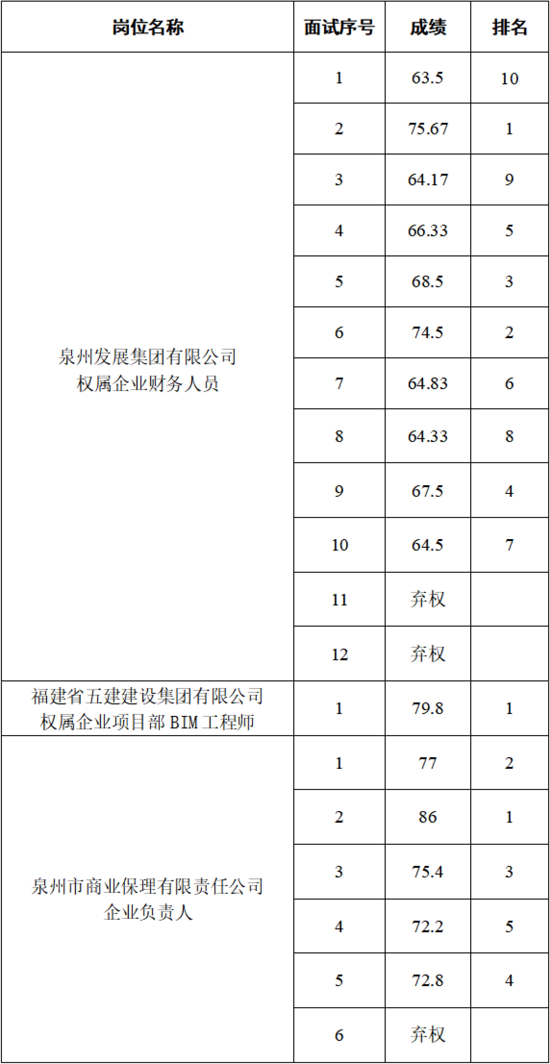 根据泉州发展集团人才引进招聘工作安排,现将2025年1月9日开展的部分岗位面试成绩公示如下: