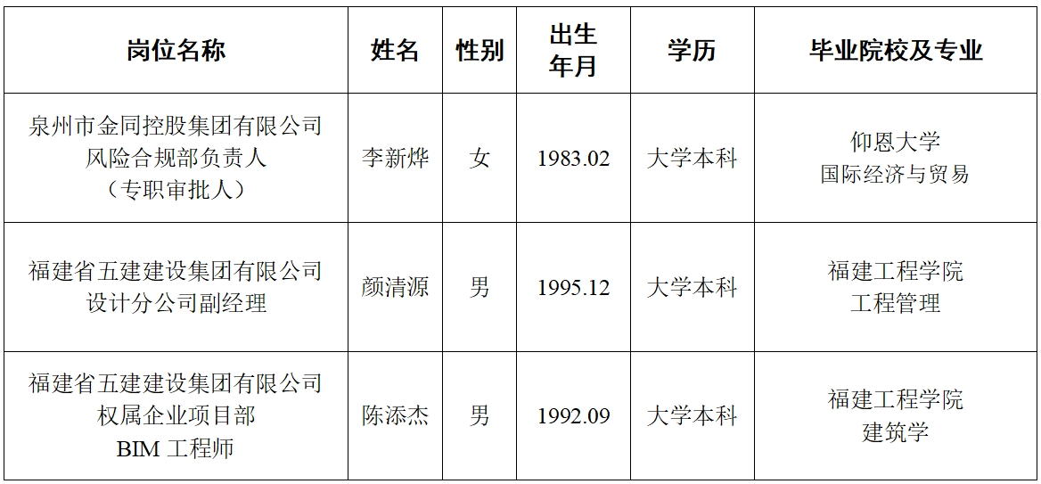 根据泉州发展集团2024年12月4日发布的人才引进招聘公告工作安排,现将部分岗位拟录用人员名单进行公示。公示期间,如对公示对象有异议,请及时向我司反映。拟录用人员名单如下: