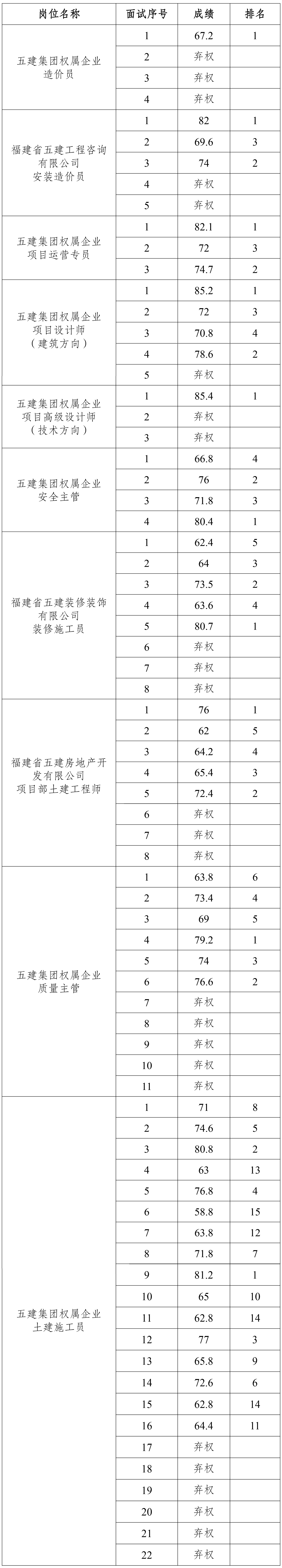 根据福建五建集团2025年第一批公开招聘项目制人员招聘工作安排,现将2025年5月21日—5月24日开展的面试成绩公示如下: