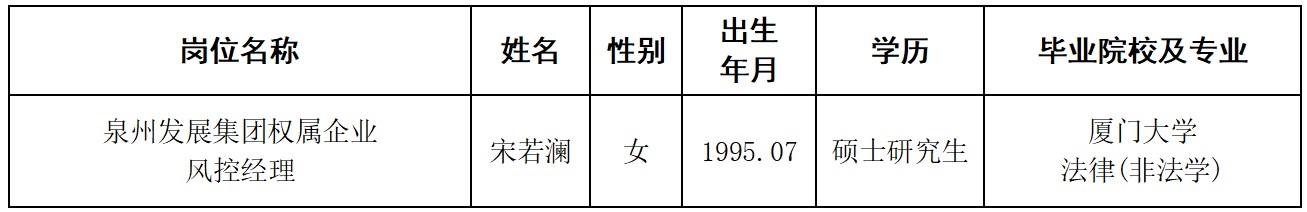 根据泉州发展集团2025年度(第一批)人才引进招聘工作安排,现将有关岗位拟录用人员名单进行公示。公示期间,如对公示对象有异议,请及时向我司反映。拟录用人员名单如下: