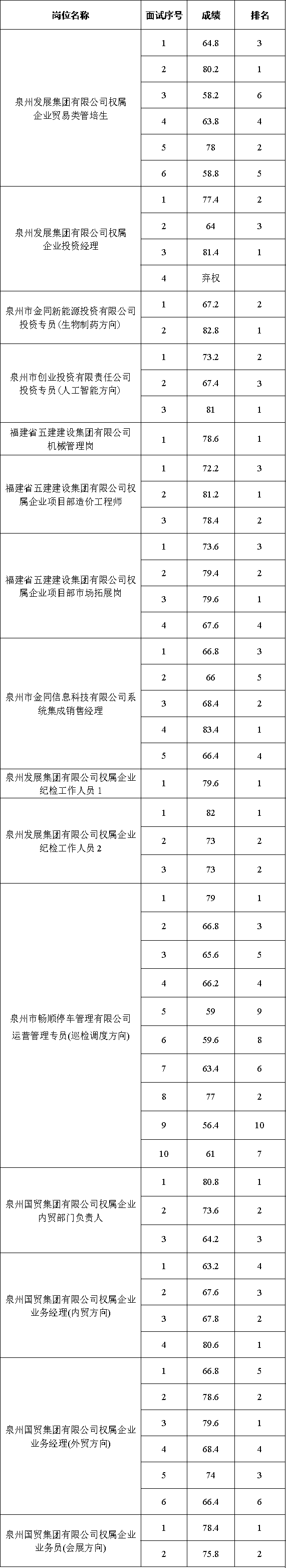 根据泉州发展集团招聘工作安排,现将2024年7月16日-7月17日开展的部分岗位面试成绩公示如下: