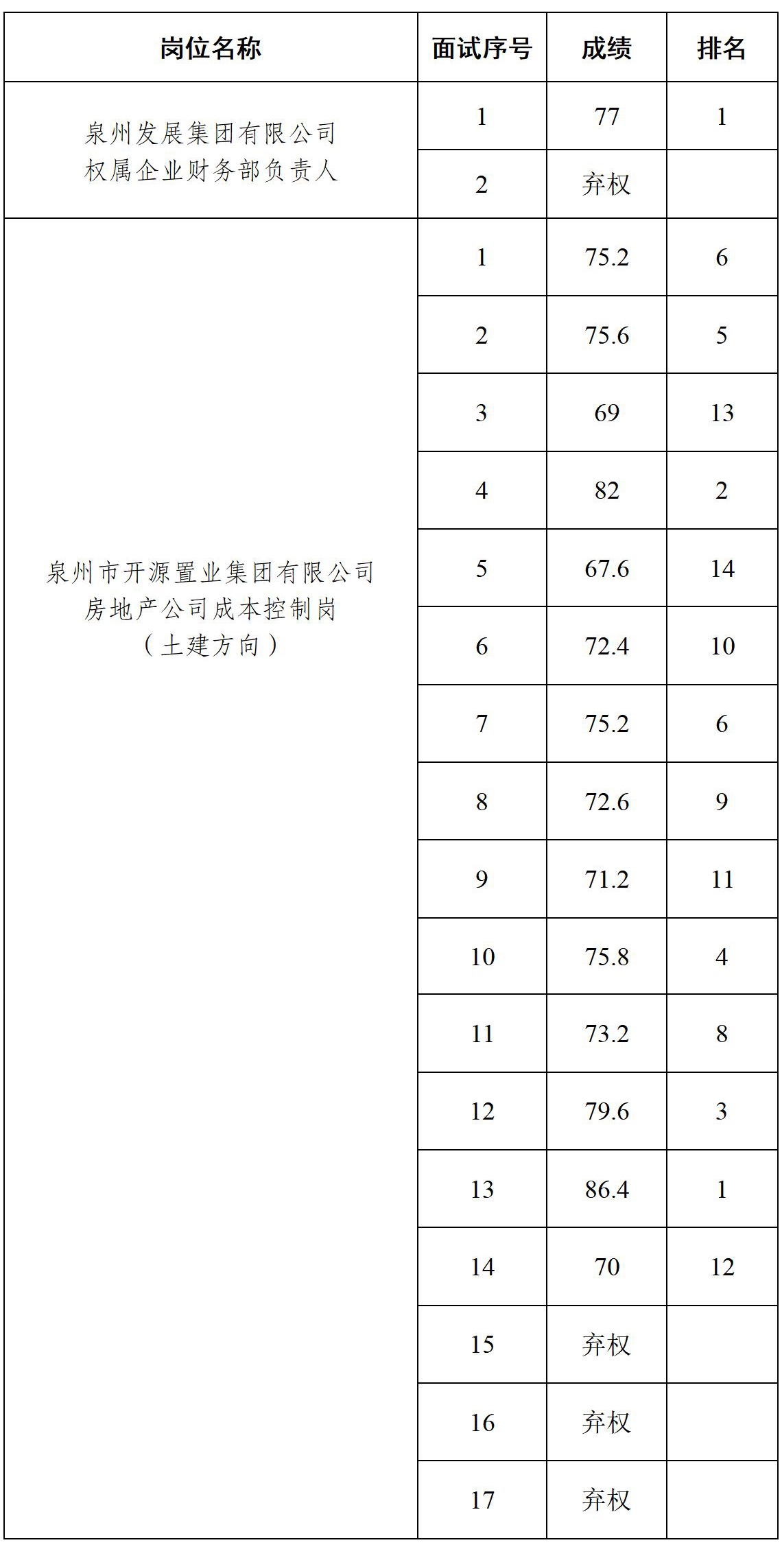 根据泉州发展集团人才引进招聘工作安排,现将2025年1月16日开展的部分岗位面试成绩公示如下: