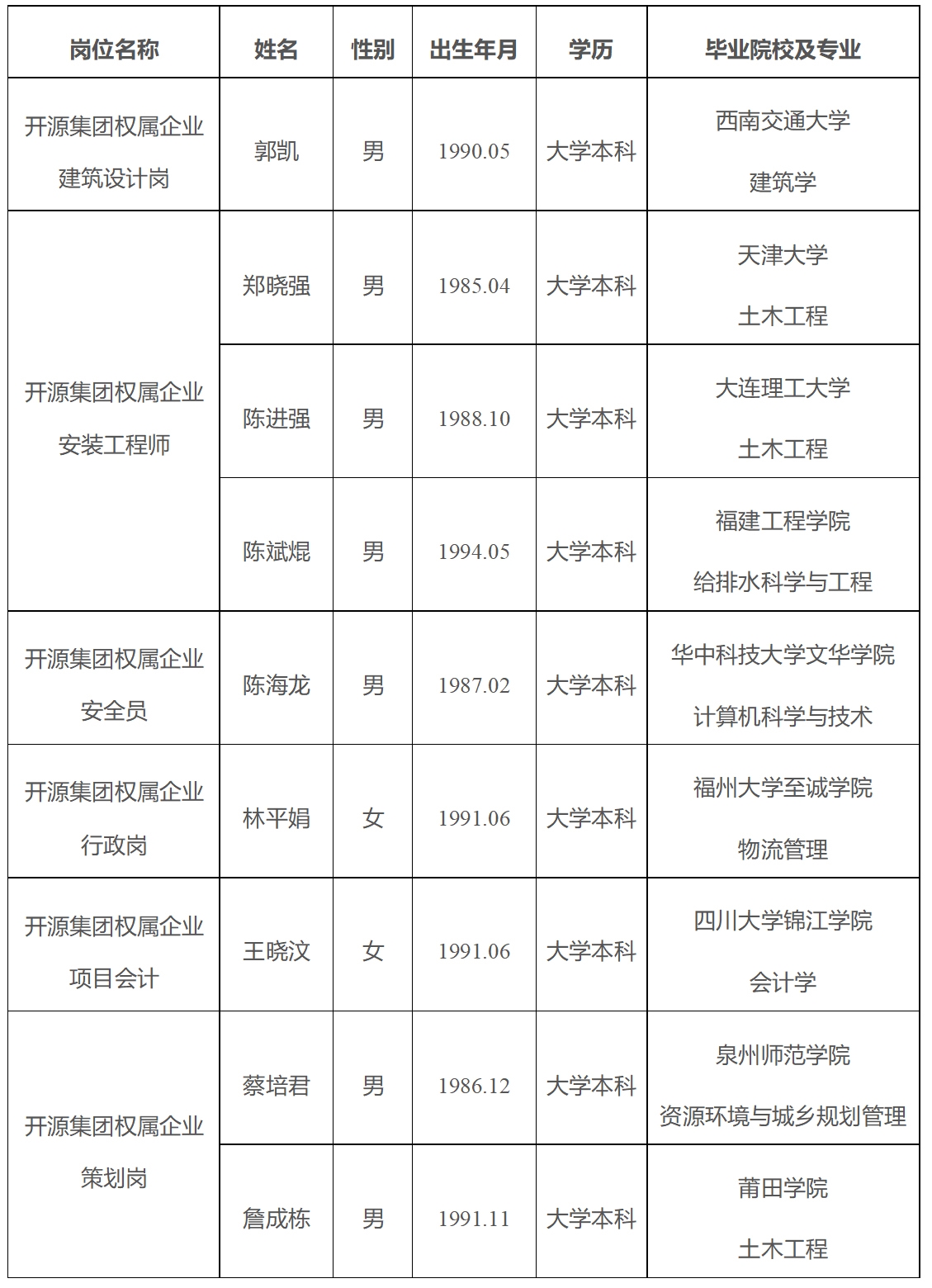 根据开源集团2025年3月11日发布的项目制工作人员招聘公告工作安排,现将部分岗位拟录用人员名单进行公示。公示期间,如对公示对象有异议,请及时向我司反映。拟录用人员名单如下: