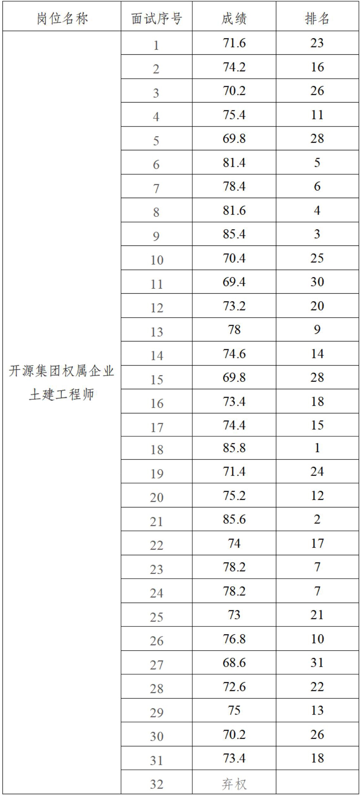 根据开源集团项目制工作人员招聘工作安排,现将2025年4月18日开展的部分岗位面试成绩公示如下: