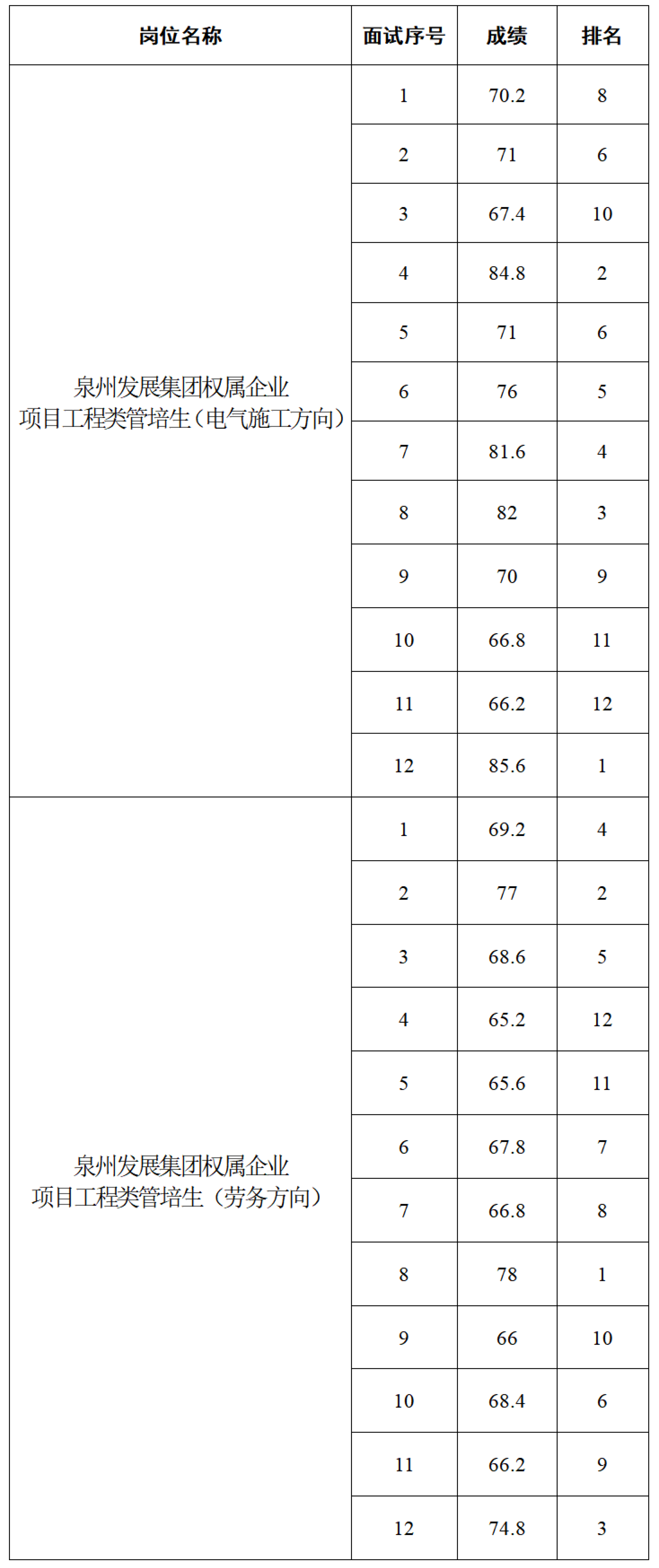 根据泉州发展集团2025年度(第一批)校园招聘工作安排,现将2025年4月29日开展的部分岗位面试成绩公示如下: